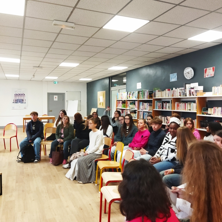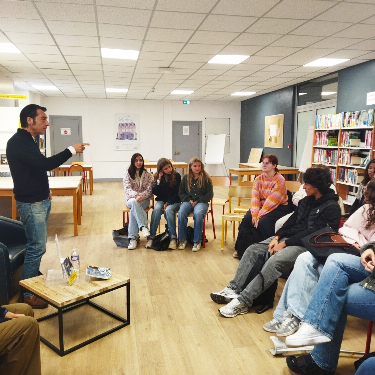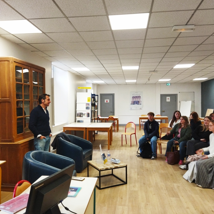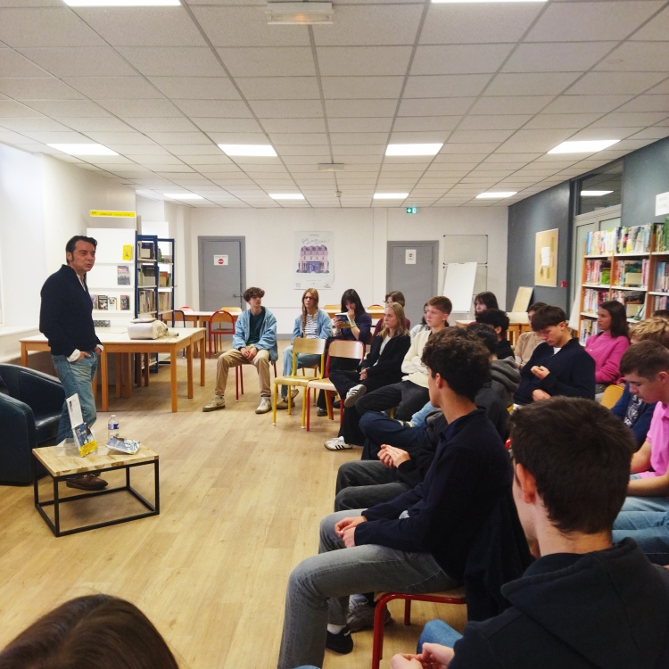 Vendredi 10 octobre, plusieurs classes de 1ère ont eu la chance de rencontrer Maxime Rossi qui vient de publier "La tournée", chez l'Iconoclaste. Outre ce premier roman qui raconte avec sensibilité la tournée d'un infirmier libéral de campagne, Maxime Rossi est infirmier à l'hôpital et infirmier-pompier volontaire. Une triple casquette qui a permis d'aborder de nombreux thèmes avec les élèves et leurs professeurs - mesdames Proffit, Lafforgue, Leroux, Dezobry et Vuillaume - : le lien social, l'écriture, les changements de vie, l'édition, la lecture, le métier d'infirmier, l'engagement... Ultime casquette : Maxime Rossi est lui-même ancien élève du lycée Saint-Vincent. La boucle était bouclée !
