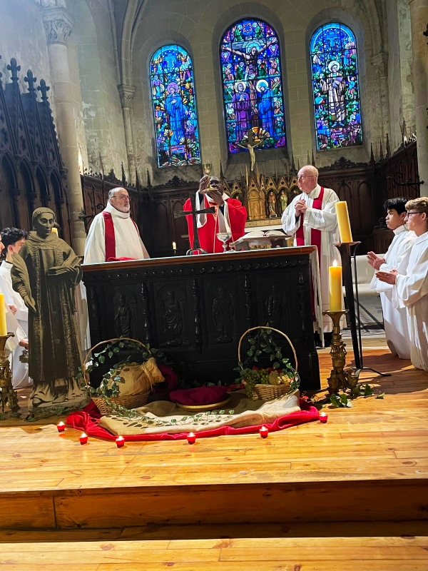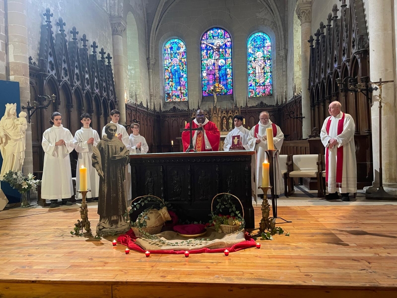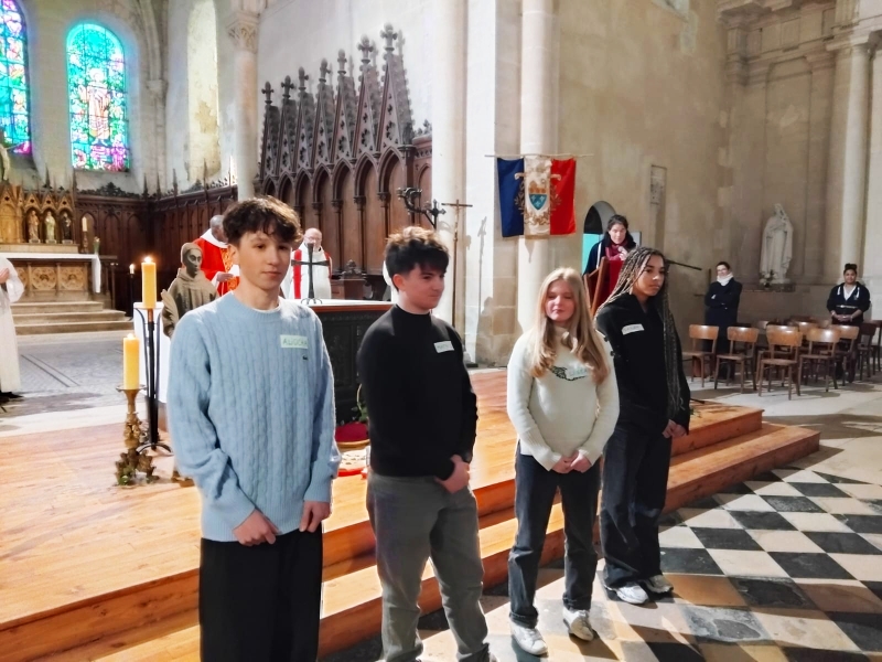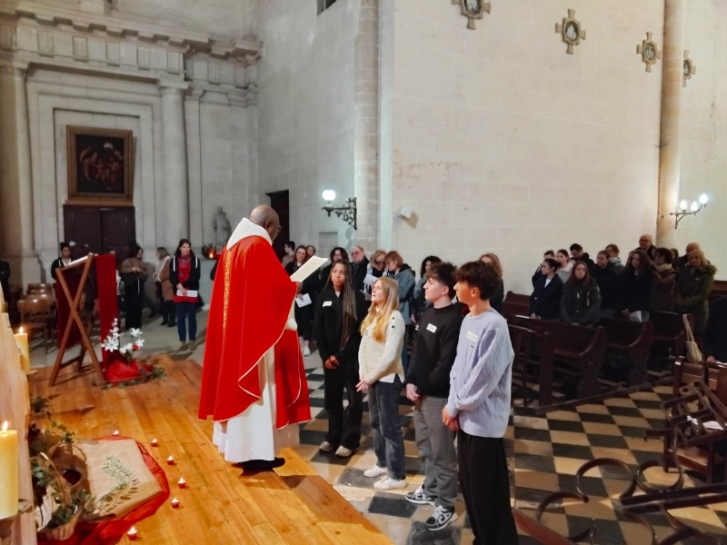 Le 22 janvier, dans notre lycée, fêter la Saint-Vincent est devenu une "nouvelle tradition" ! Lors de la belle messe, animée par classe de seconde 4, en présence de trois prêtres - le Père Séraphin, le Père Jimmy et le Père Georges, ancien élève du lycée - 5 élèves sont entrés en catéchuménat. Ils recevront le sacrement du baptême dans la nuit Pascale du 4 avril, à la cathédrale de Senlis. C'est Mme de Montlebert qui les accompagne sur ce chemin. Sarah, Aliocha, Mathis, Liséa et Sarah (absente sur les photos) ont frappé à la porte de l'église sous les chants enjoués de l'orchestre et de la chorale. Après la célébration, Mattéo, élève de terminale, a proposé un mini-concert d'orgue et une déambulation préparée par "Maristes en Education" a esquissé la vie de notre Saint-Patron. La soirée s'est achevée en galerie par un apéro aux chandelles, logique pour honorer le patron des vignerons ! Une belle illustration de notre thème de l'année : Héritiers, artisans d'avenir, nous sommes et resterons ! (Photos M Derricke, Mme Poirier, Mme Peix)